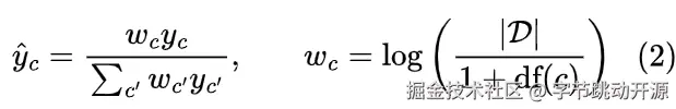 我们使用类别(子词)的逆文档频率(IDF)统计作为分类标签的权重,为分类标签 c 分配不同的权重: