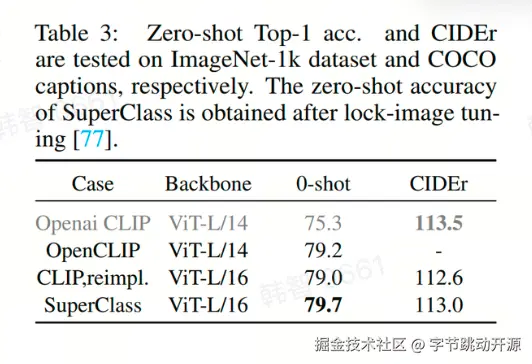 - 在 Text-VQA 任务上,SuperClass 明显取得了比 CLIP 更好的精度和 Scalability ,团队推测,SuperClass 训练可能可以学习到更强的 OCR 能力。