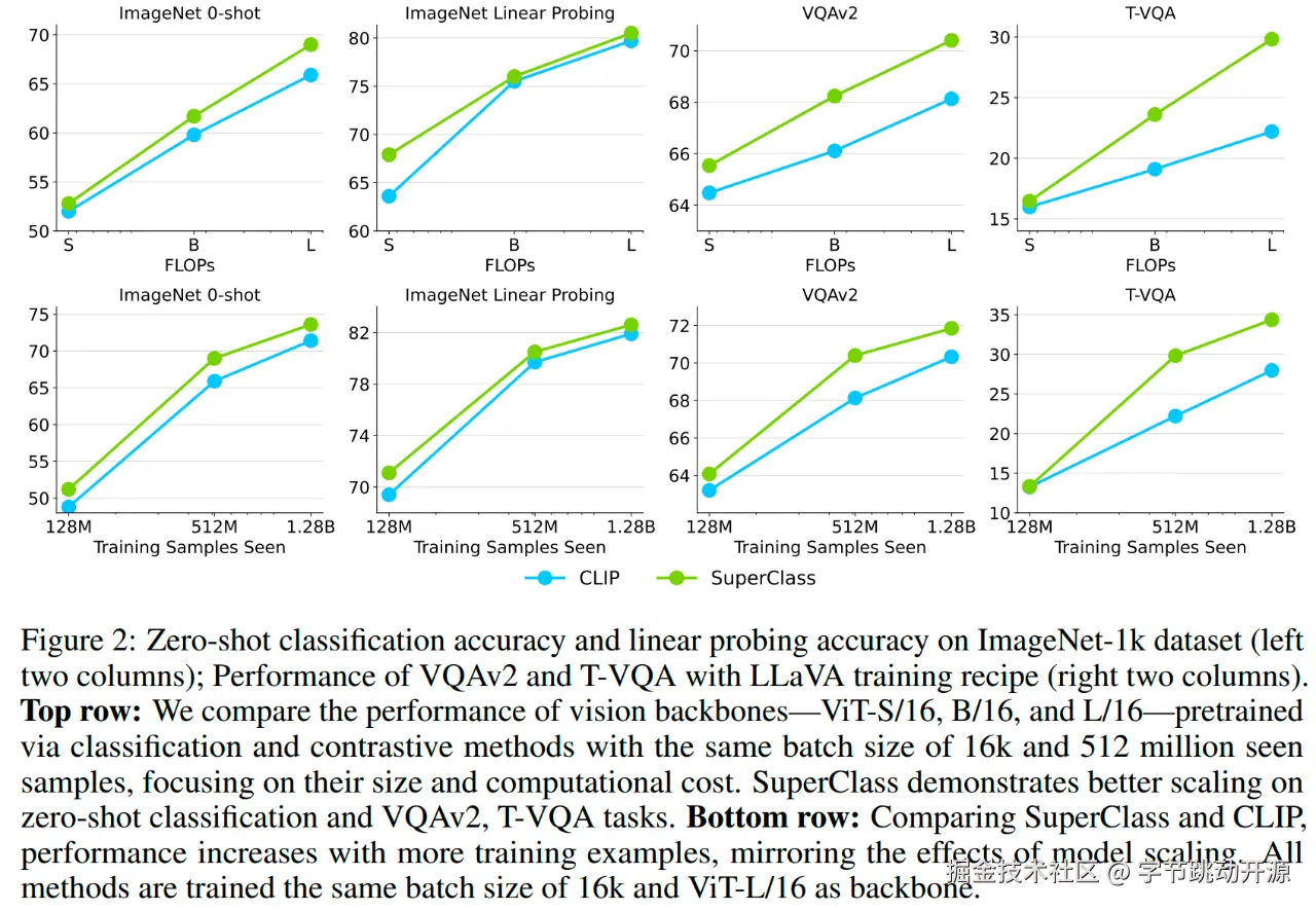 - 在纯视觉任务和多模态下游任务上,SuperClass 和 CLIP 具有相似的 Scalability;