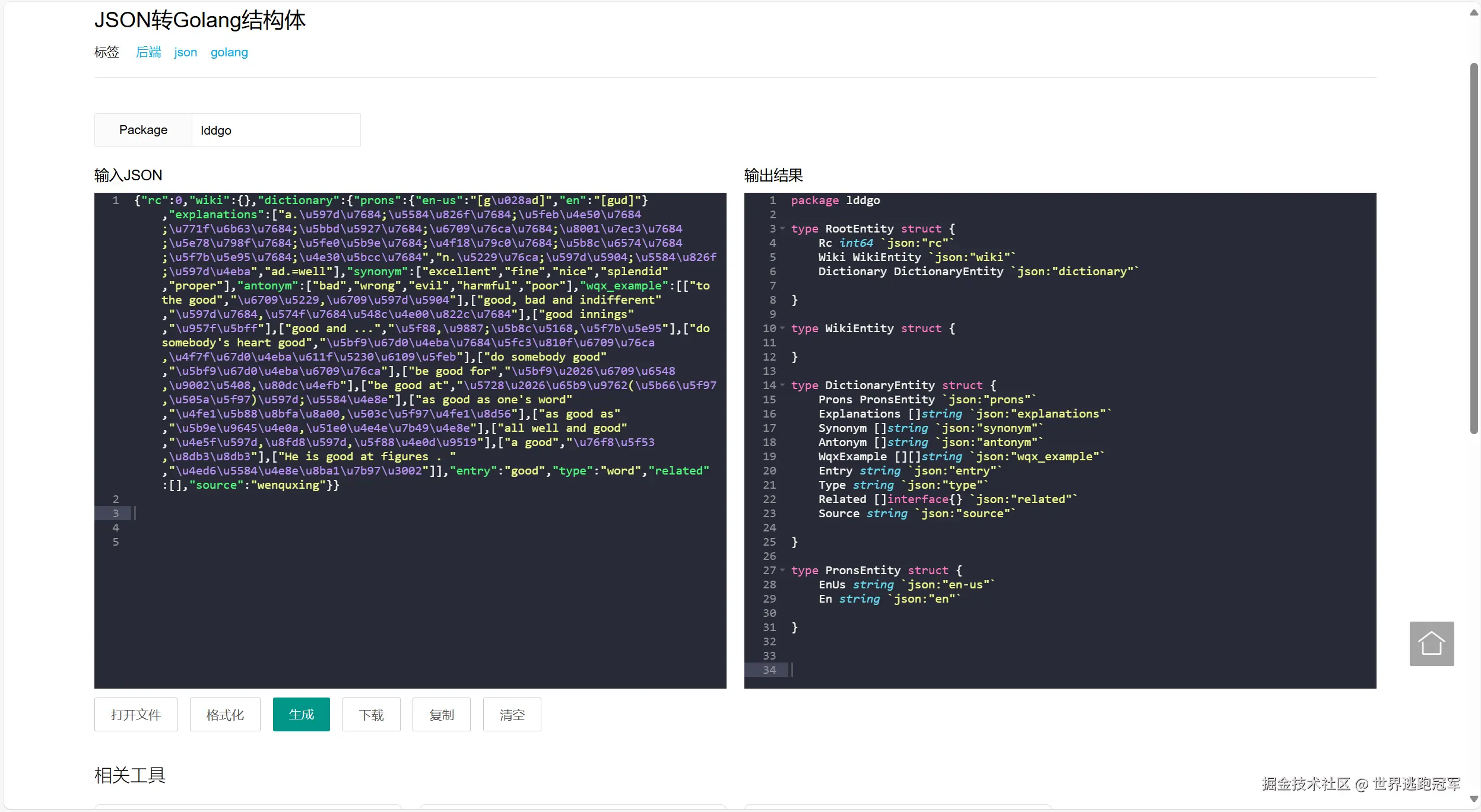 json转golang struct:oktools.net,这个网站打不开,找了一个新的JSON转Golang结构体,但是用这个生成了好几个结构体,不能生成视频中所示的嵌套结构体