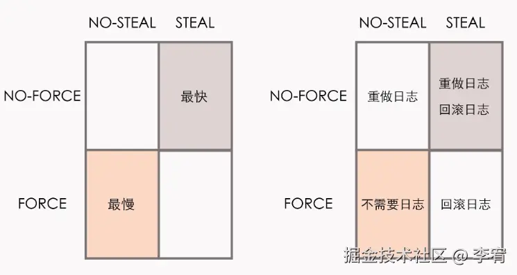 - **最佳组合:**NO-FORCE + STEAL,性能最高但实现复杂。