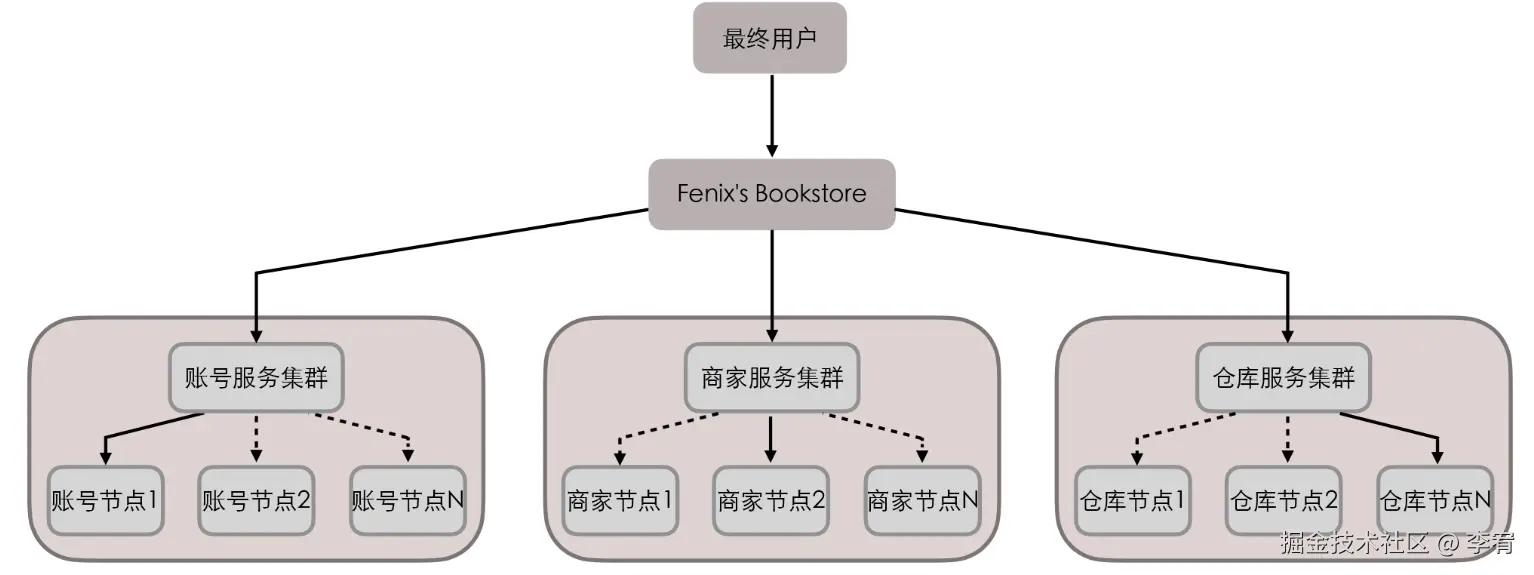 - **服务拓扑:**账号、商家、仓库服务集群