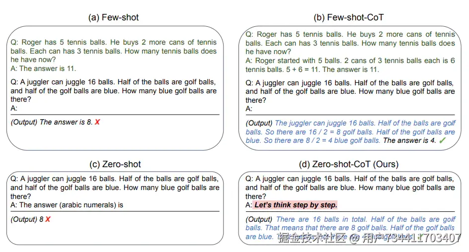 图中的(d)示例非常非常有意思,在Zero-Shot CoT中,你只要简单地告诉模型“让我们一步步的思考(Let's think step by step) ”,模型就能够给出更好的答案!