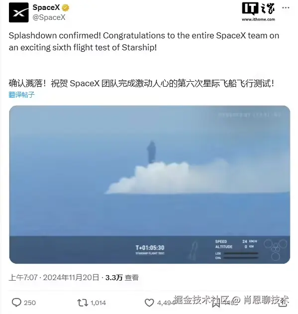 - SpaceX 星舰第六次试飞圆满成功,超重型助推器完成软溅落后解体