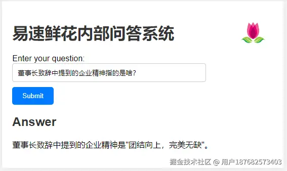 运行程序之后,我们跑起一个网页 http://127.0.0.1:5000/。与网页进行互动时,可以发现,问答系统完美生成了专属于异速鲜花内部资料的回答。
