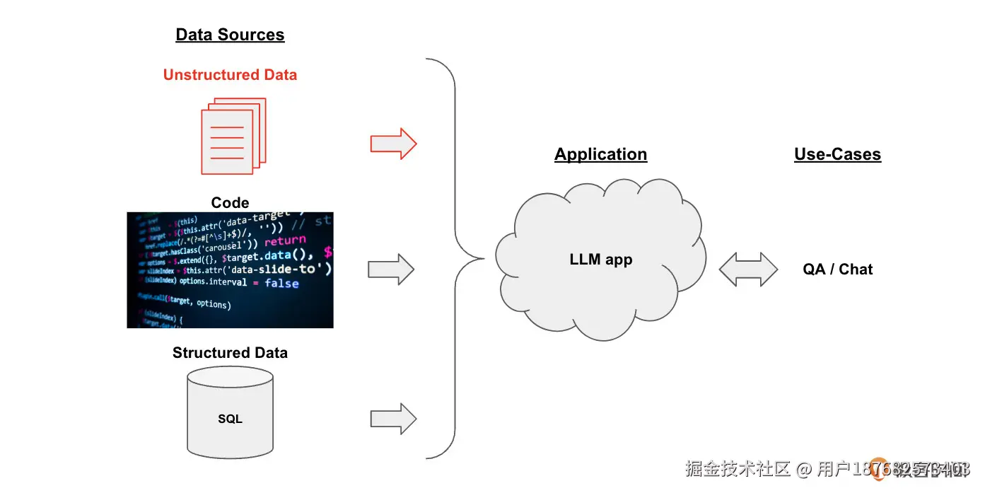 - 数据源(Data Sources):数据可以有很多种,包括PDF在内的非结构化的数据(Unstructured Data)、SQL在内的结构化的数据(Structured Data),以及Python、Java之类的代码(Code)。在这个示例中,我们聚焦于对非结构化数据的处理。
