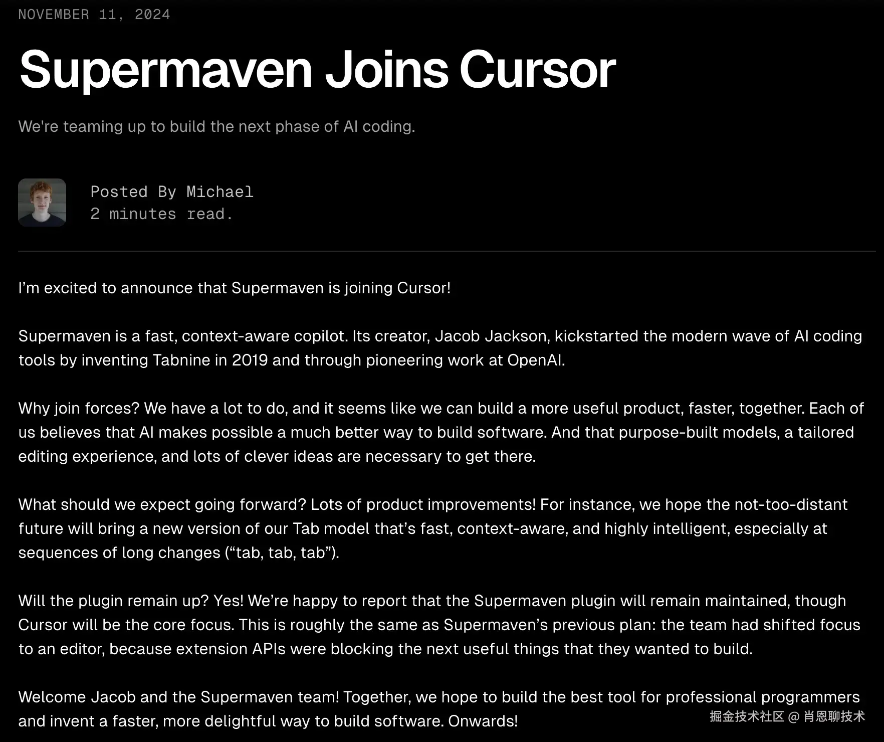 - Cursor 母公司 Anysphere 收购 AI 编码助手 Supermaven