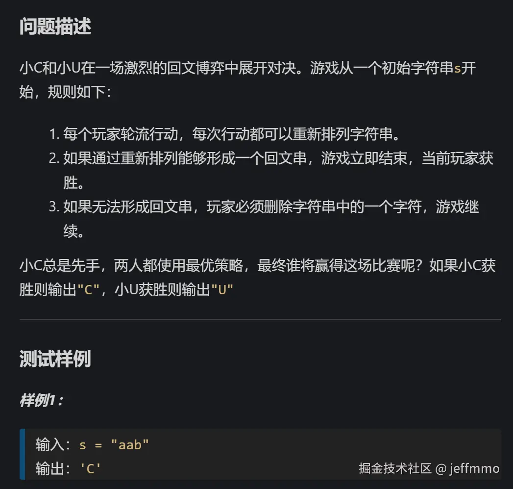 这道题目本质上是一个博弈论问题,结合了字符串操作和回文串的特性。解题步骤主要基于以下几点: