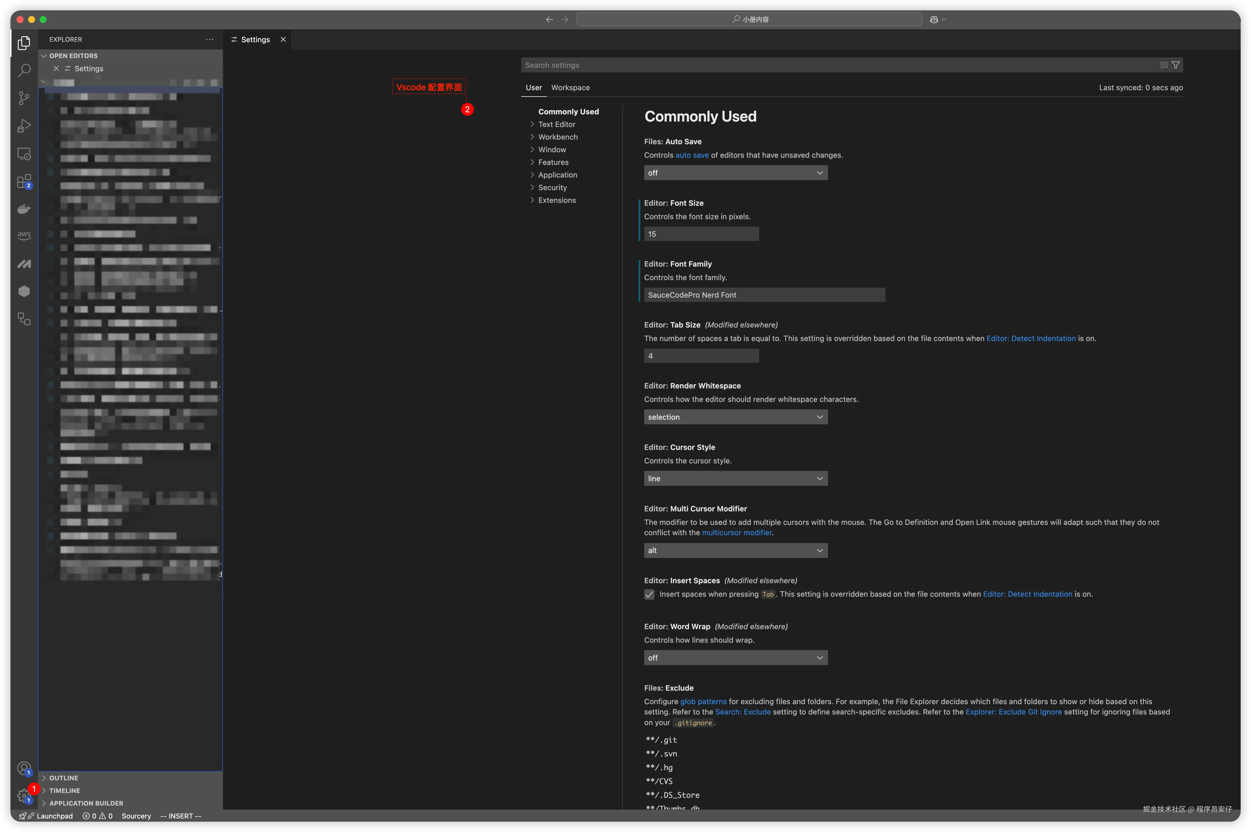打开设置(json)图标,打开 settings.json 文件 - 在 settings.json 中添加以下配置,并保存: