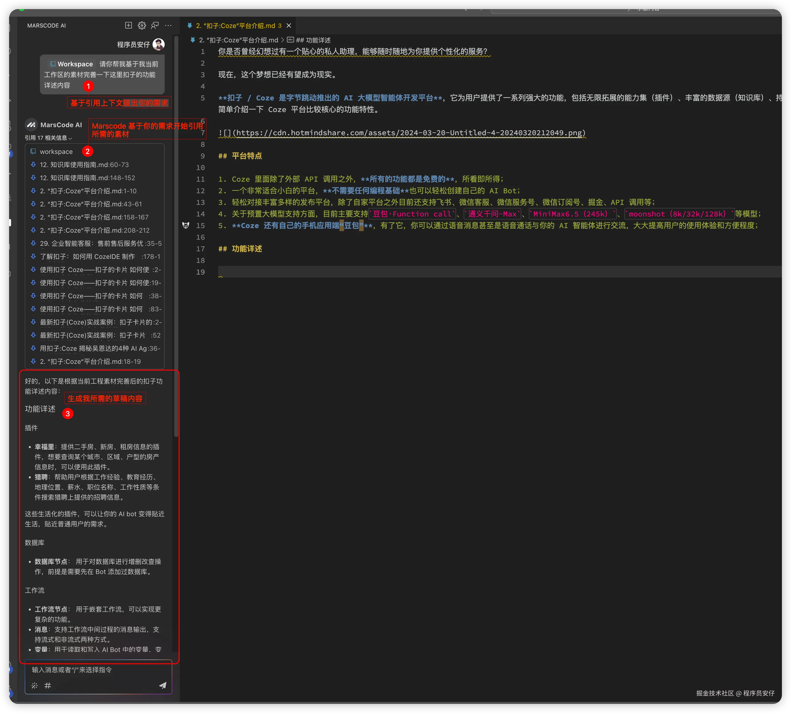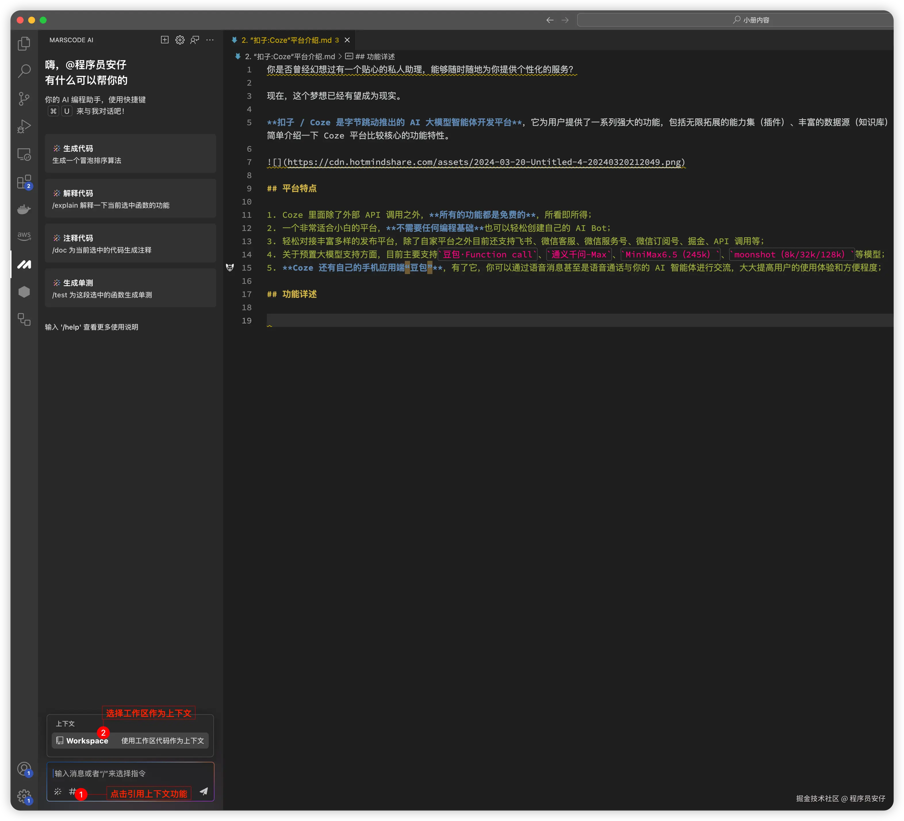 最令人惊喜的是,Marscode 的 AI 助手拥有基于工作区的智能上下文理解。当你提出需求时,它会自动分析工作区内容,从中提取相关素材作为上下文来回答问题。这种能力让它不仅能 保持写作风格的一致性,还能 提供更有针对性的建议,真正做到与你的写作意图和场景完美契合。