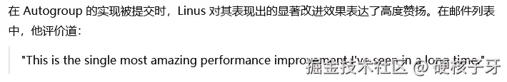 讲到这,你应该知道组调度存在的意义了。在Linux内核中,有两套组调度机制:一套是自动组机制,autogroup,这套机制的出现,让Linux之父linus大为赞叹;一套是可供用户配置的cgroups