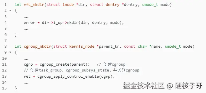 在cgroups目录下创建目录,为什么会调用到vfs_mkdir呢?因为在创建目录的时候,Linux内核会检测到这是个挂载目录