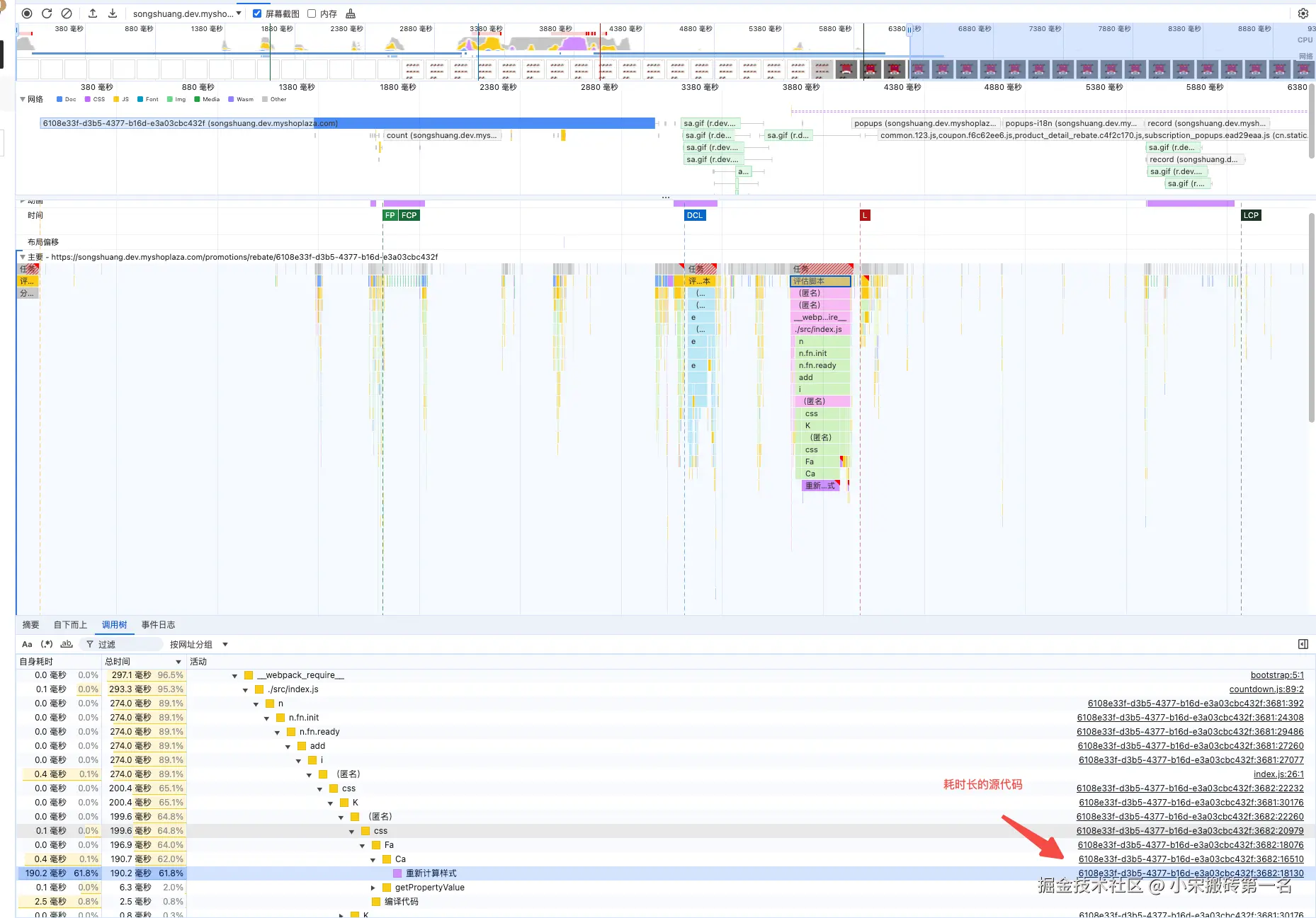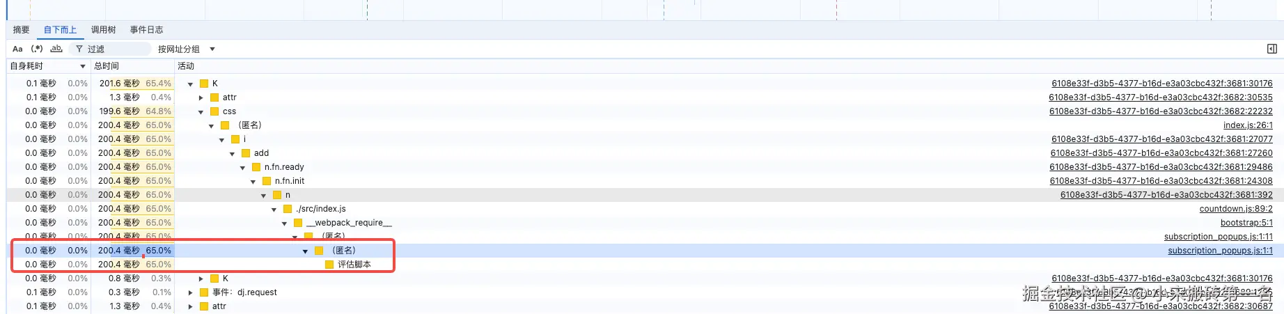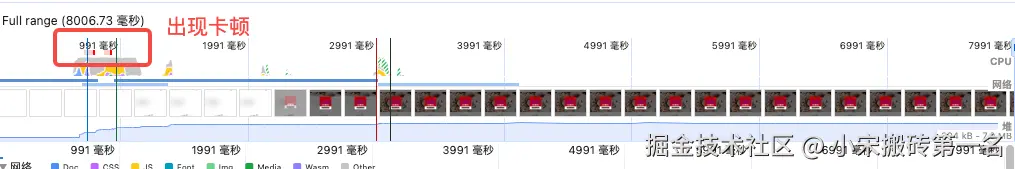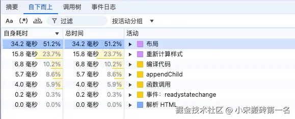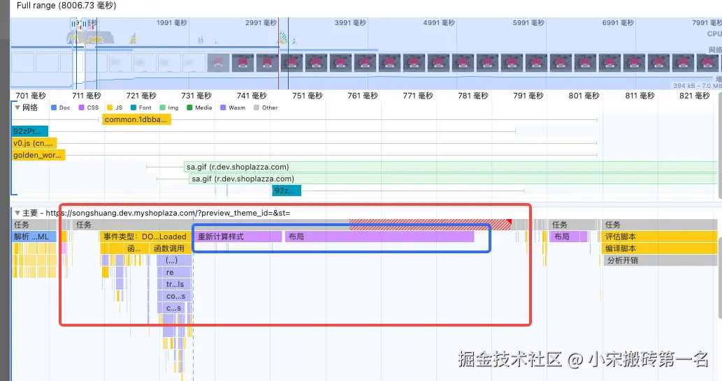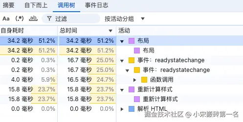 在屏幕截图板块,上方部分表示帧率(每秒钟显示的图像帧数量),如果出现了下图框住的红色块,表示有卡顿,应该优化。选择该时间段,从主线程任务板块可以看到阻塞的红色条纹方块,如图2-3所示。在主线程任务板块,可以看出耗时长的原因在于重新计算样式和布局,点击耗时长的任务,在面板最下方,点击自下而上或者调用树,可以看到具体的耗时文件,以及源代码所在文件。