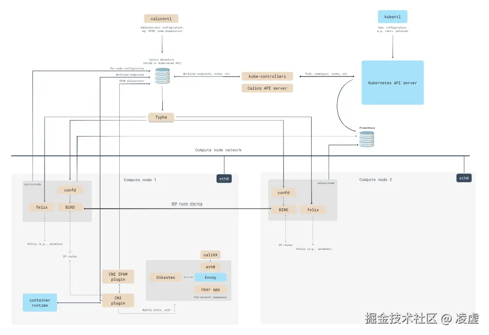 Calico API server:用户可以使用 kubectl 直接管理 Calico 资源。Calico kube-controllers:监控资源并执行操作。Datastore plugin:使用kubernetes API或etcd存储数据。Typha:作为数据存储和Felix实例之间的守护进程运行,减少数据存储的负载以增加集群规模。在大规模(100 个节点以上)的集群中必不可少。Felix:运行在每个节点上,控制节点的网络接口、路由、ACL 流量控制和安全策略、以及报告状态等。BIRD:在承载Felix的每个节点上运行,从Felix获取路由并分发给网络中的BGP对等点,用于主机间路由。confd:监控数据存储中 BGP 配置和 AS 号、日志级别和 IPAM 等全局默认值的变化,动态生成BIRD配置文件,并触发 BIRD 加载新的配置。Dikastes:可选,为 Istio 服务网格执行网络策略。作为 Istio Envoy 的 sidecar 代理在集群上运行。CNI plugin和IPAM plugin。calicoctl:命令行工具。