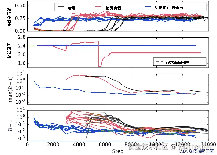 update [--update]:协方差矩阵的定期更新,superupdate [--superupdate]:跳跃因子的额外自适应,superupdate + Fisher [首先 --method Fisher;然后 --superupdate]:相同,但从蒙特卡罗 Python 计算的逆 Fisher 矩阵开始。