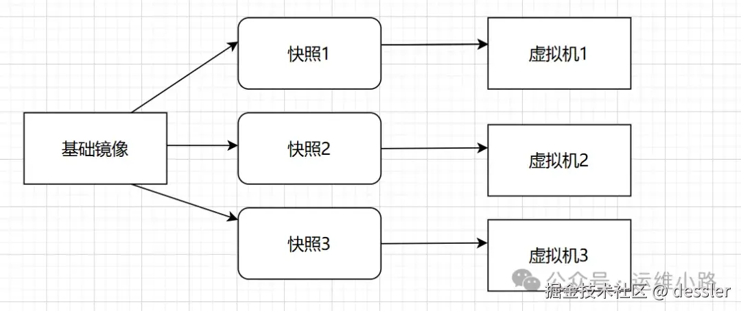 我们在稍微延申一下,是不是可以使用一个基础镜像,然后创建的虚拟机都是一个快照,这样我们就可以复用基础镜像,创建虚拟机实际就只做一个快照的时间,创建的虚拟机的速度就会很快,而且还可以节约磁盘。因为一个普通的linux至少在2G左右,创建10个就需要20G,如果用刚才的技术,2G的基础镜像和10个快照(每个200M)上一小节的数据,就可以节约16G的空间。