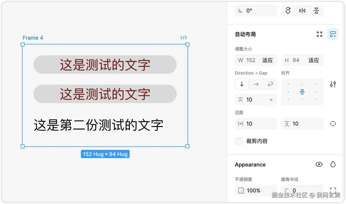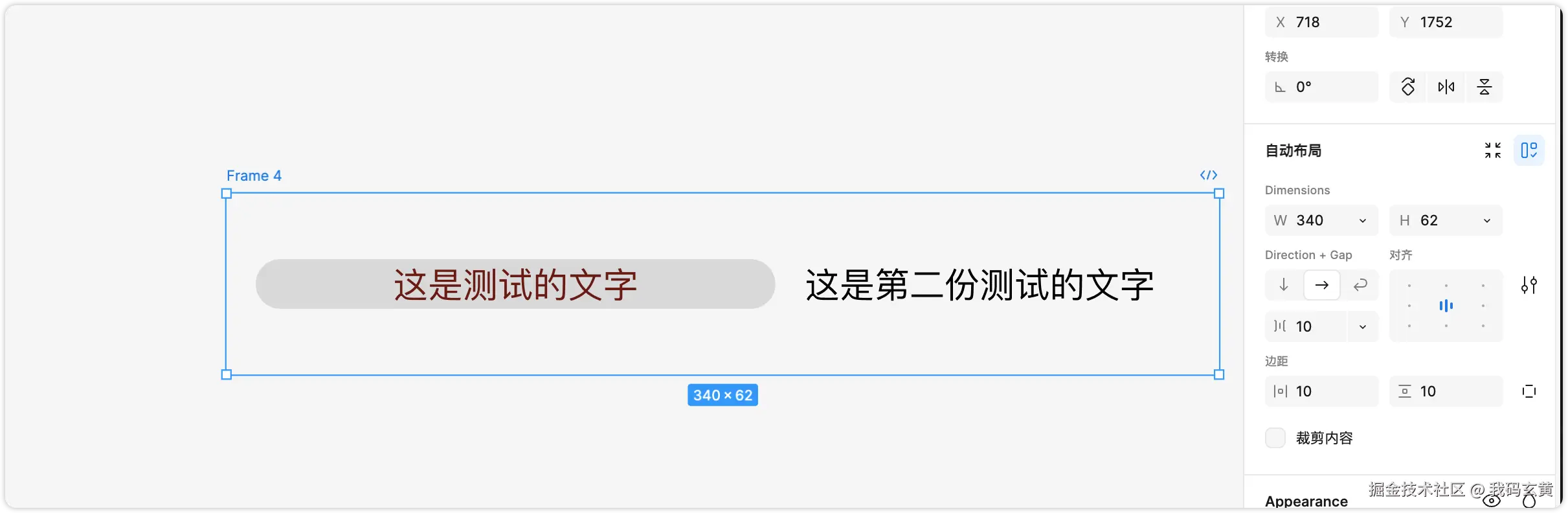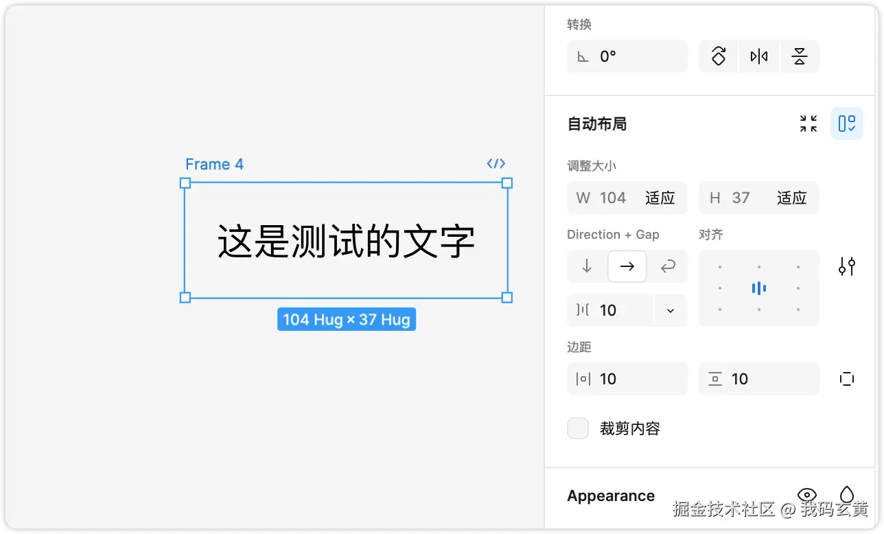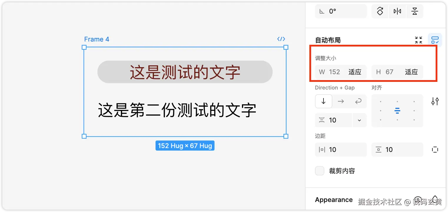 选中后 Shift+A 会对这个文字组件套上一个 frame 框,此时我们可以看到右边的自动布局设置。