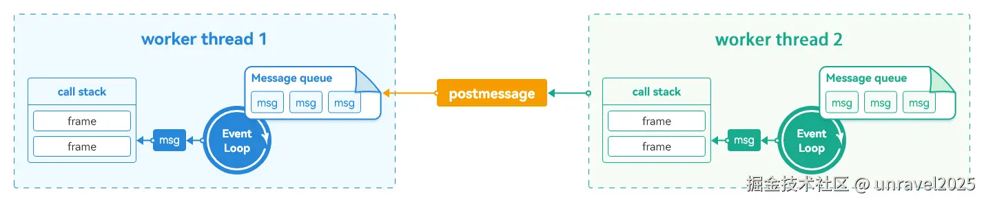 Worker拥有独立的运行环境,每个Worker线程和主线程一样拥有自己的内存空间、消息队列(MessageQueue)、事件轮询机制(EventLoop)、调用栈(CallStack)等。线程之间通过Message进行交互