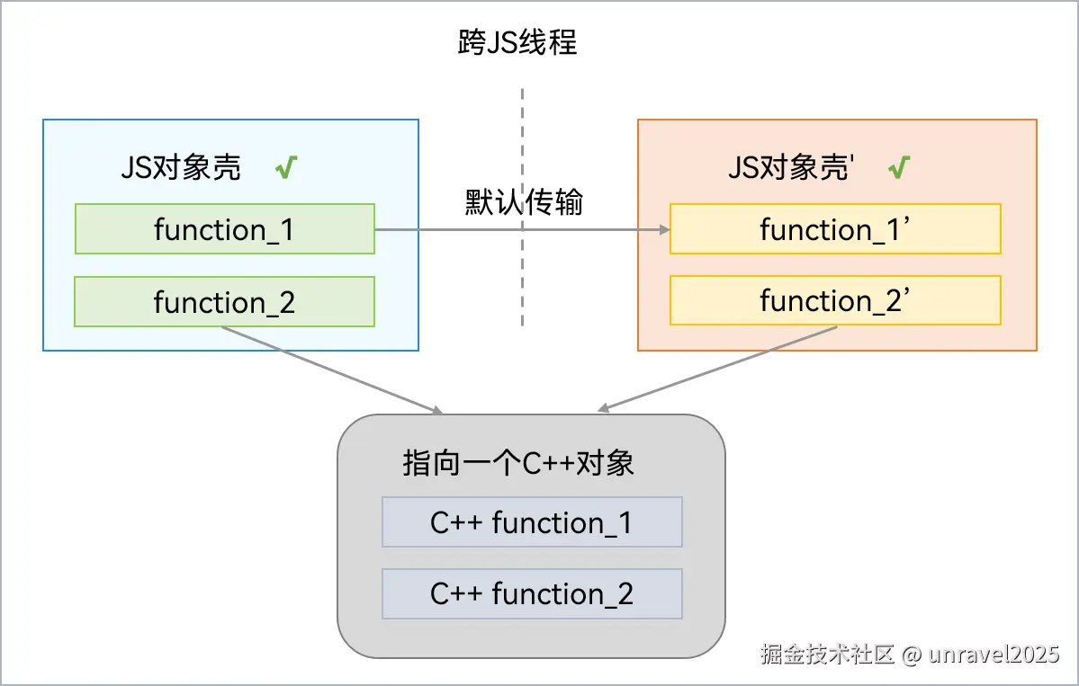 - 此时,NativeBinding对象跨线程传输后,只需要重新创建JS壳,就可以桥接到相同的C++对象上