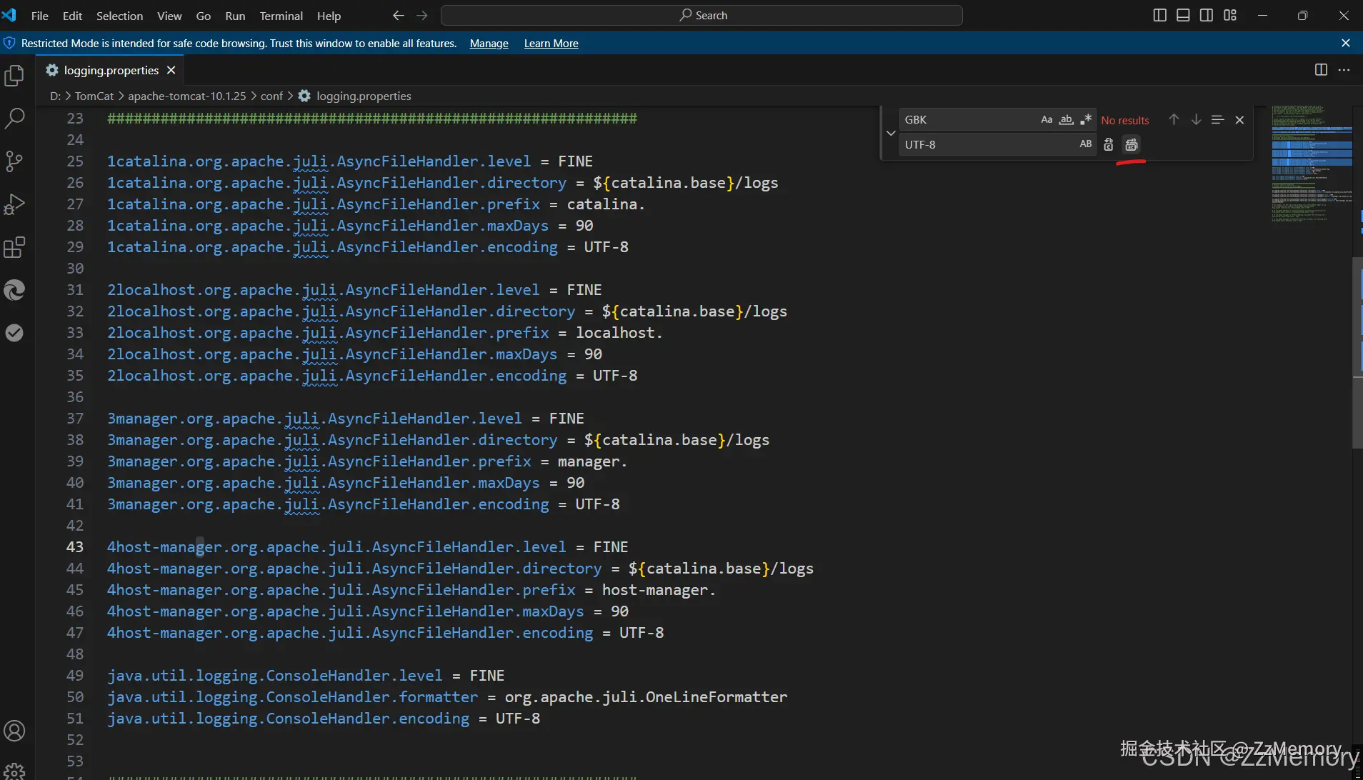 这是关于Tomcat方面的配置,只需要点开"apache-tomcat-10.1.25\conf\logging.properties",将文件中的所有GBK都改为UTF-8,这里可以使用快捷键"Ctrl+F",一键替换,省去了查找的功夫。