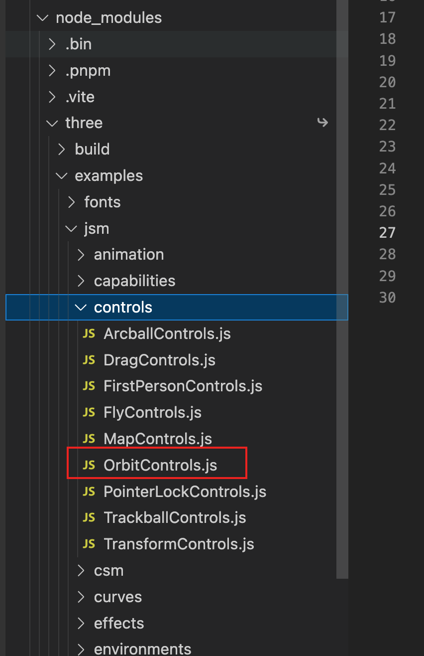 - 最后,引入相机控制器。相机控制器不能直接通过 Three.OrbitControls()的方式引入,如果你是通过 npm 包管理器安装的 three.js,那么你可以在 node_modules/three/examples/jsm/controls 中找到 OrbitControls.js 文件,然后通过 import 的方式引入。