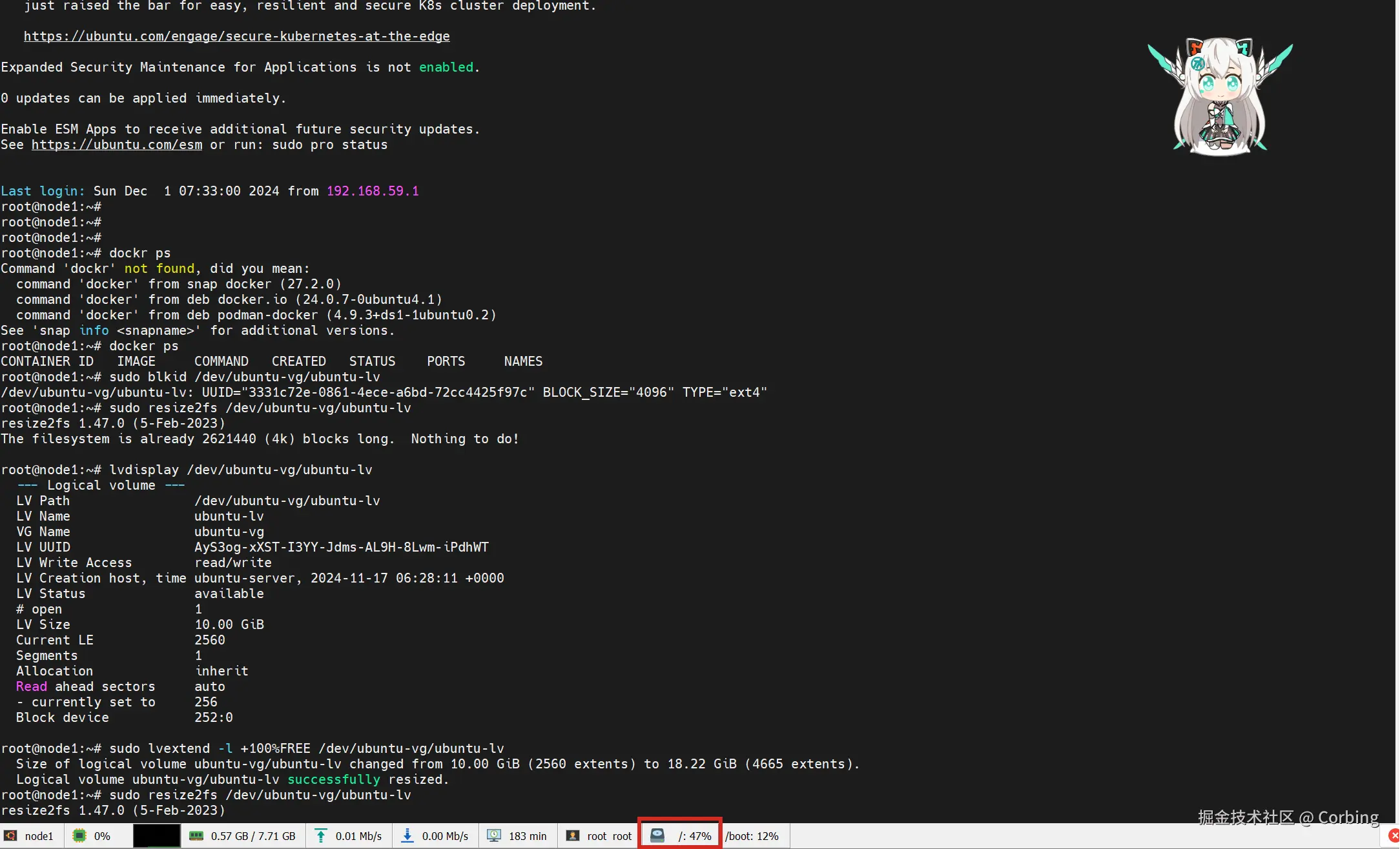完成上述操作后,检查文件系统和逻辑卷的大小: