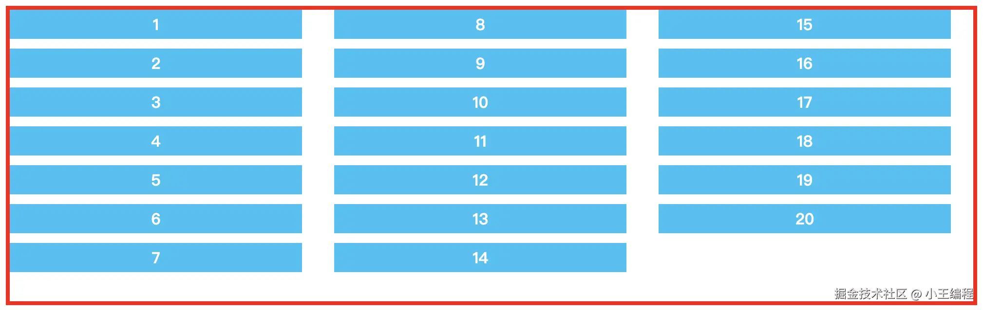 正常来说,想要实现从上到下,从左到右排序,很多朋友不会的都跑去使用JS实现,实际上使用Flex布局轻松实现。主要就flex-wrap: wrap,允许换行 和 flex-direction: column,主轴方向切换位Y轴。