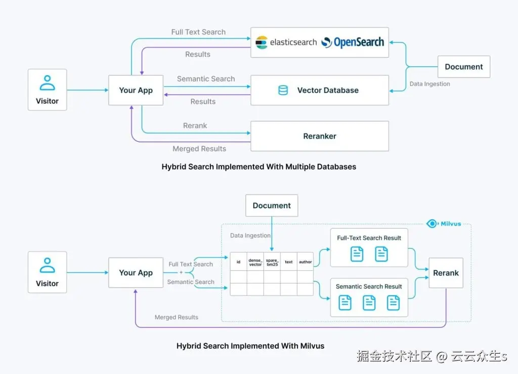 实现混合搜索的一种常见方法是使用专用向量数据库,例如开源的Milvus,用于高效且可扩展的语义搜索,以及像Elasticsearch或OpenSearch这样的传统搜索引擎用于全文搜索。