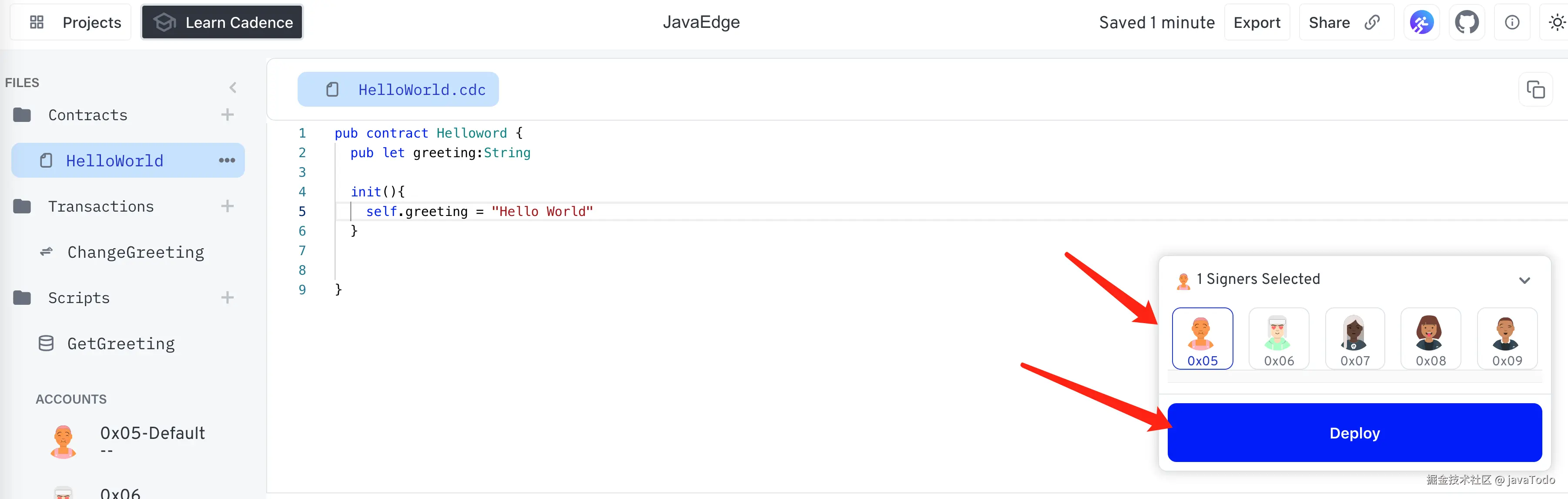 编写完合约部分代码,需要确认用户并部署: