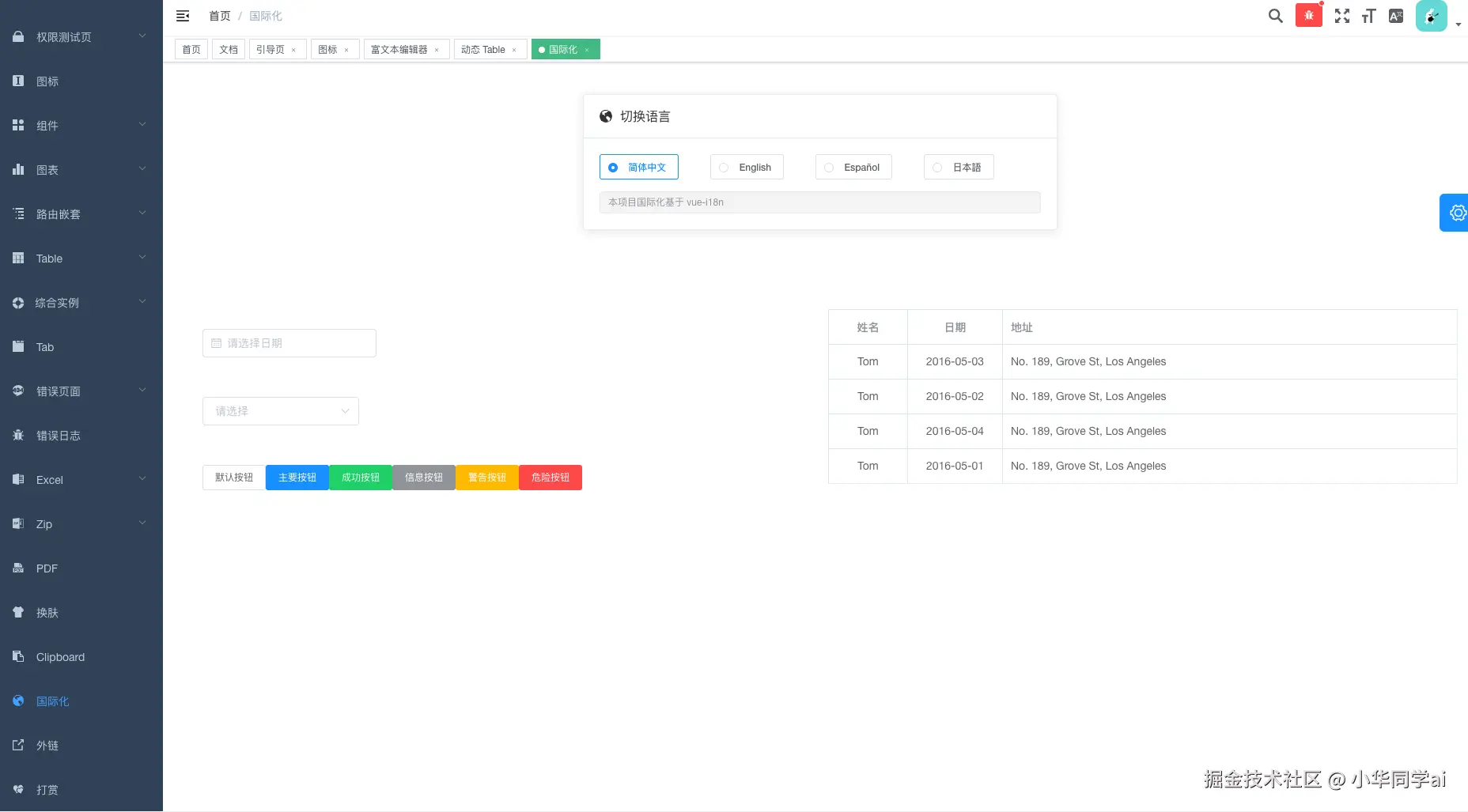 - 全局功能:包括国际化多语言、动态换肤、动态侧边栏、动态面包屑、快捷导航、Svg Sprite 图标等。