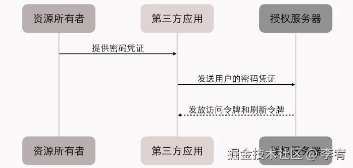 - **特点:**适用于高度可信的第三方应用,认证和授权合一,安全性依赖用户和第三方应用。