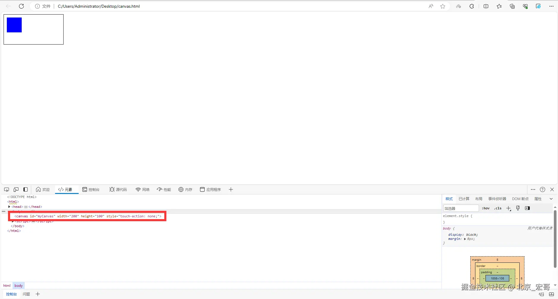 3.接下来我们用上边的canvas的demo来演示拖拽,同理:其实在我们上一篇中掌握如何定位canvas元素后,拖拽就非常简单了,无非就是一些鼠标的操作事件罢了。然而却在实践过程中发现并不简单,虽然可以定位到但是操作不了。宏哥觉得原因可能是canvas定位到是整个一块画布,而其上边的圆圈是通过绘画出来的,无法定位所以就无法操作了。而且按F2查看元素确实没有圆圈的元素。如下图所示: