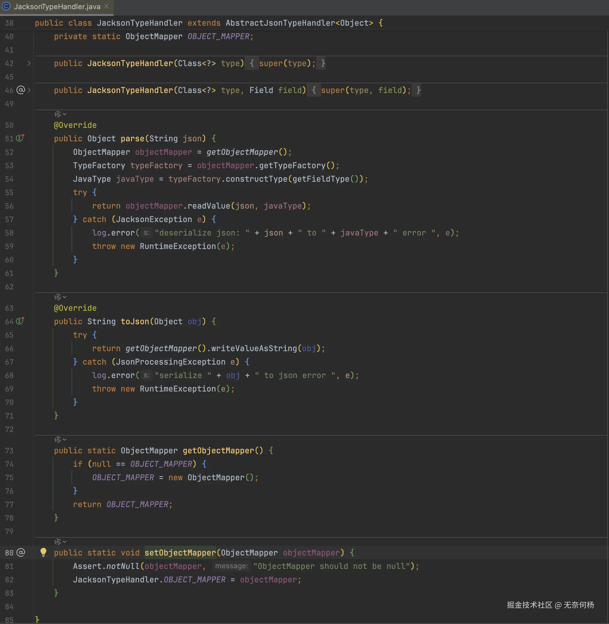 官方提供了多种类型转换器,这里是用的JacksonTypeHandler,其中有一个静态方法setObjectMapper给予用户自定义ObjectMapper的入口。如果你有使用一些Java8的LocalDateTime等需要额外配置Jackson的,最好自己设置一下。