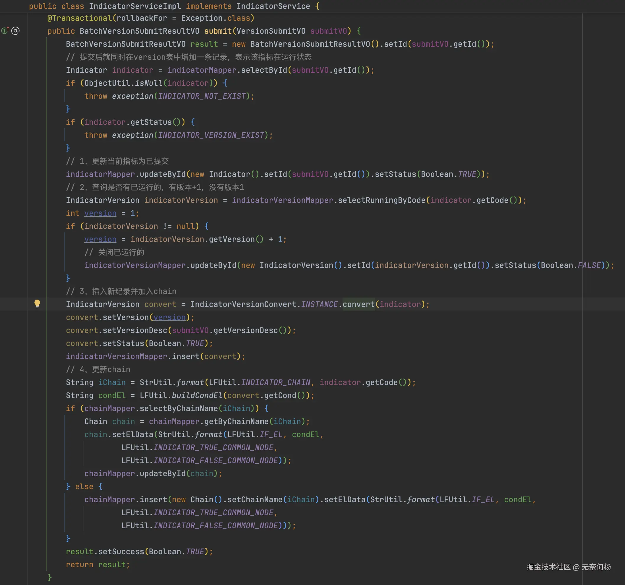 甚至不用考虑一个细节问题,还是那上篇文章举例,如下在灯泡处,也就是// 3、插入新纪录并加入chain的地方有一个指标转为指标历史的操作,这是存在问题的,因为id也被copy了,肯定会因为主键冲突导致插入历史表失败的情况。