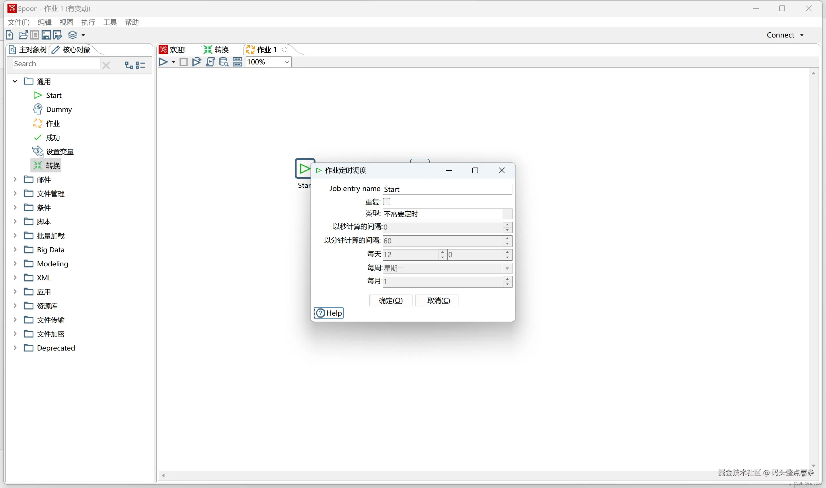 首先所有的Job都需要一个「start」入口,新建之后,在工作项处搜索start,双击生成在控制台里,然后点击start可以进行详情配置,包括定时任务,是否重复等等。