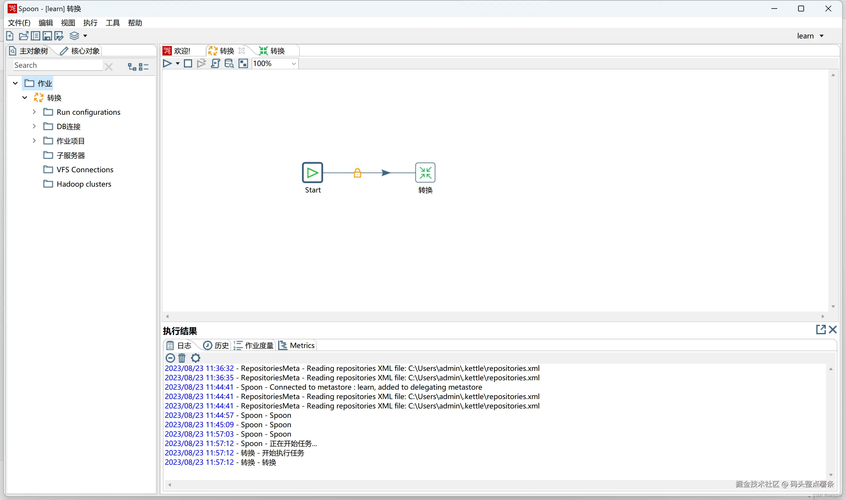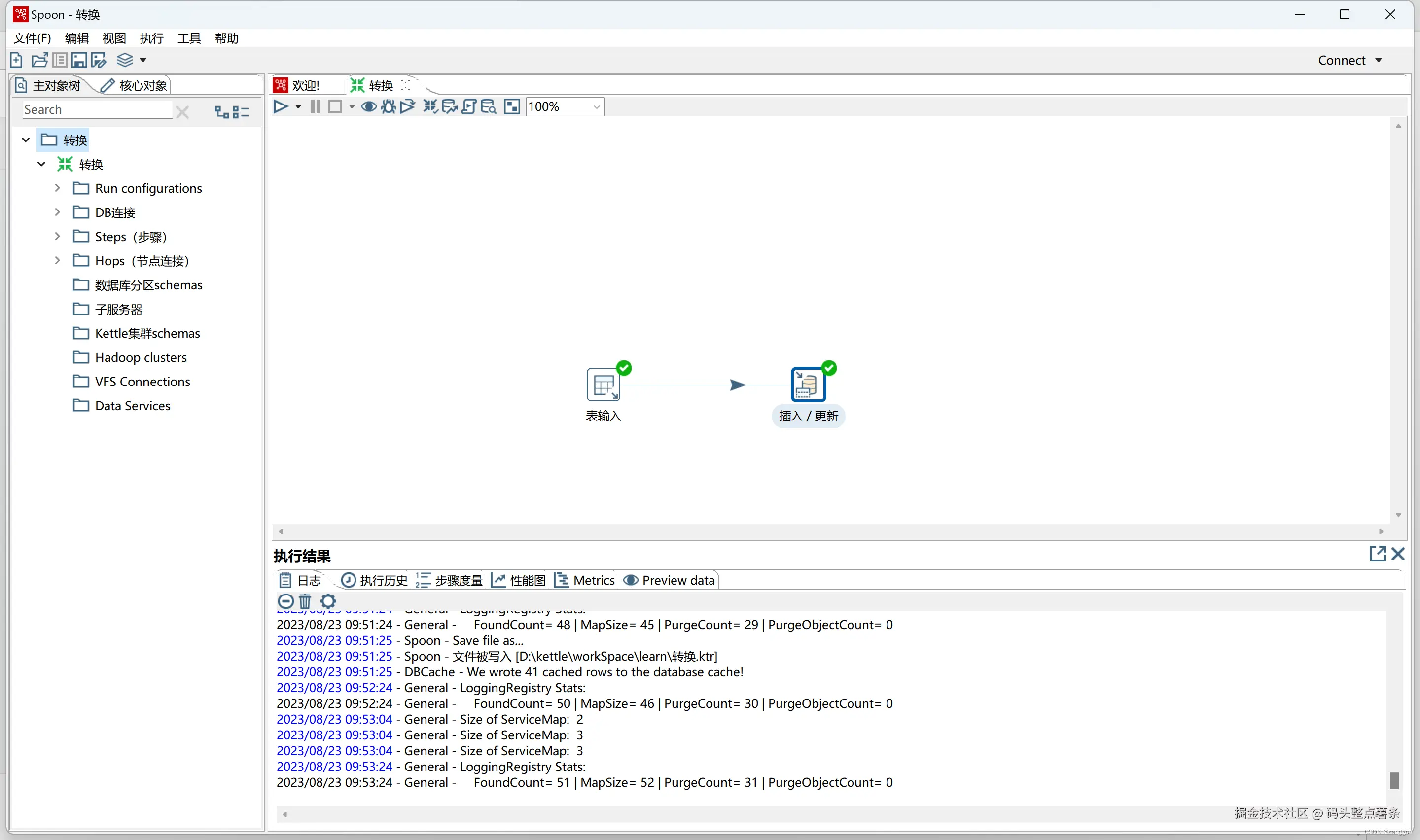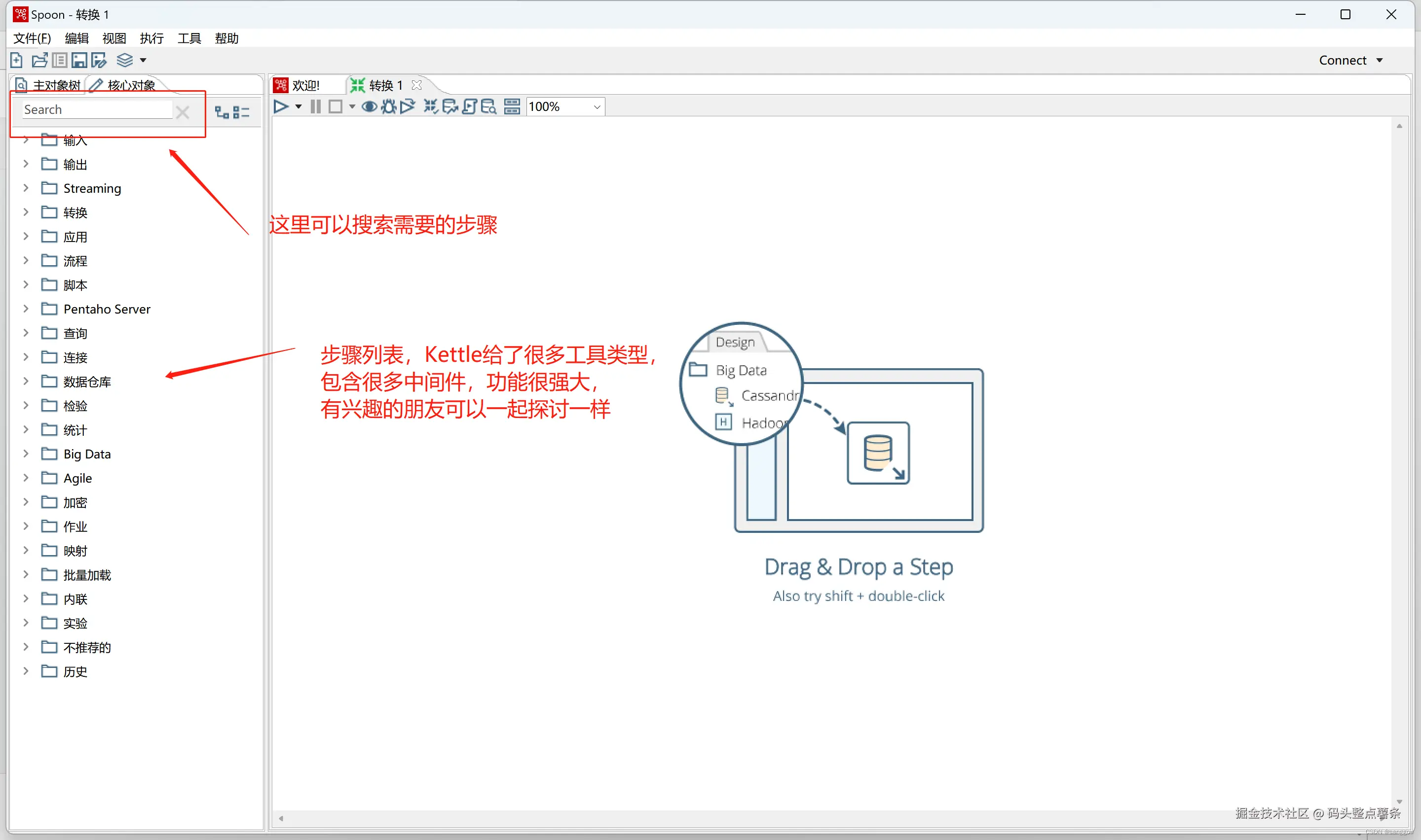 - 可视化开发界面:Kettle提供了直观易用的图形化开发界面,通过拖拽和连接组件,可以快速搭建ETL流程,减少了编码的工作量。