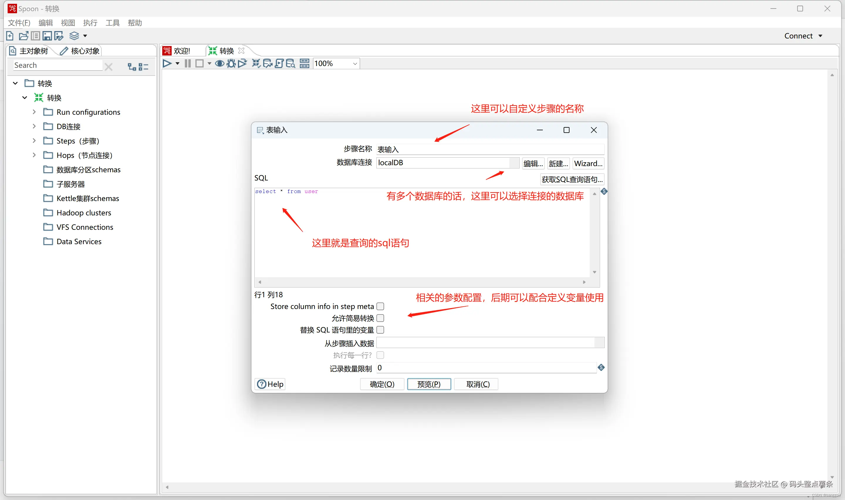 接下来在核心对象里面搜索表输入,新增步骤,然后控制台就会出现表输入的步骤,双击打开,可以进行具体内容的配置。