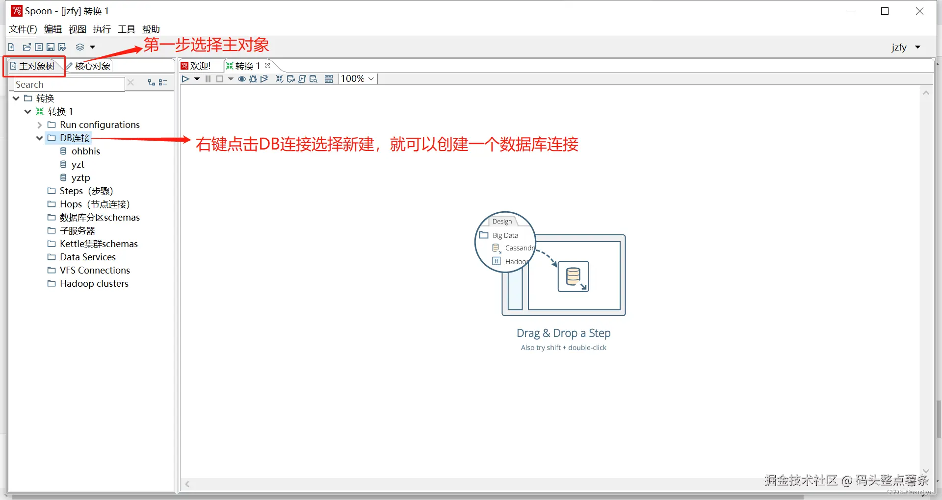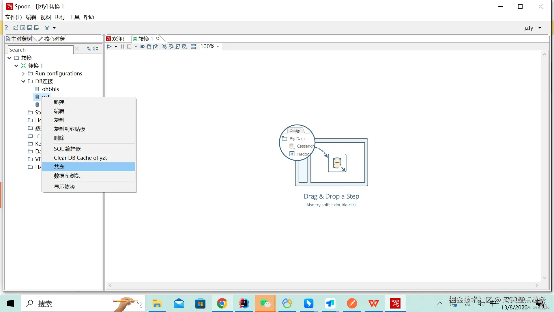 3. 数据库连接默认只对本转换有效,换一个转换以后,这个连接就没法用了,还需要新建数据库连接,所以我们需要将建好的这个数据库连接进行共享下,共享以后,其他的转换也能用我们提前建好的这个数据库连接了。