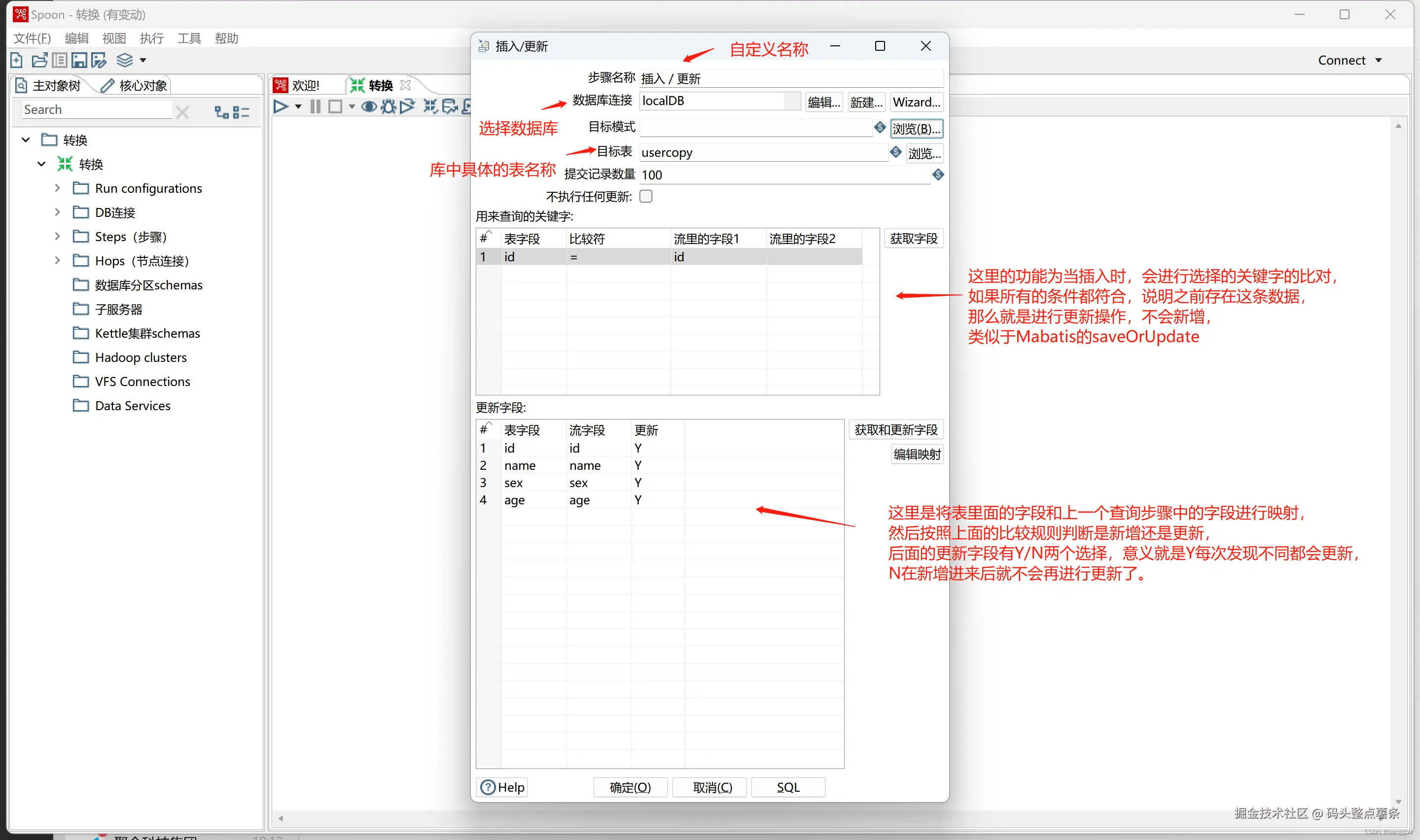 做完查询后,要将查询到的数据进行数据转移,这个时候需要步骤是插入/更新,同理在上搜索到此步骤后进行双击会自动生成到控制台上,并且会自动连线,这个箭头线代表了数据的流向,将来步骤多的情况下可以自己进行配置,配置方法为按住Shift,然后点击一个步骤不松拖到另一个步骤上就可以成功连通,点击箭头线可以对其进行具体的操作,可以自行去实验,这里双击插入更新,进行具体的配置。编辑