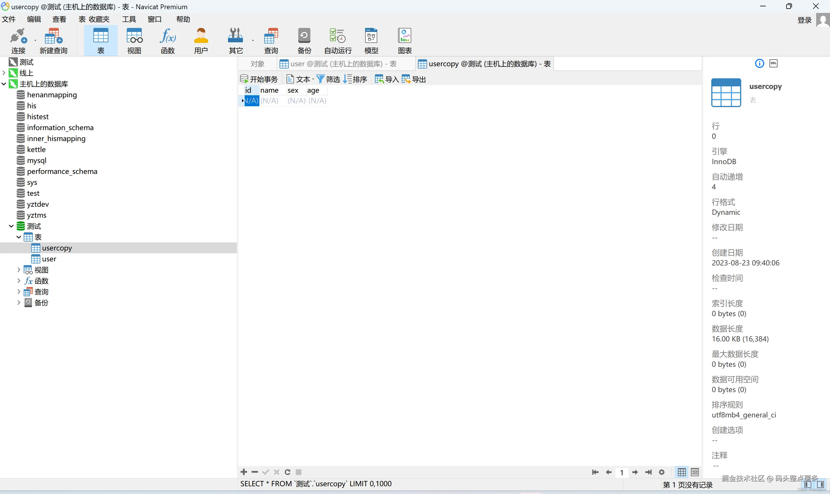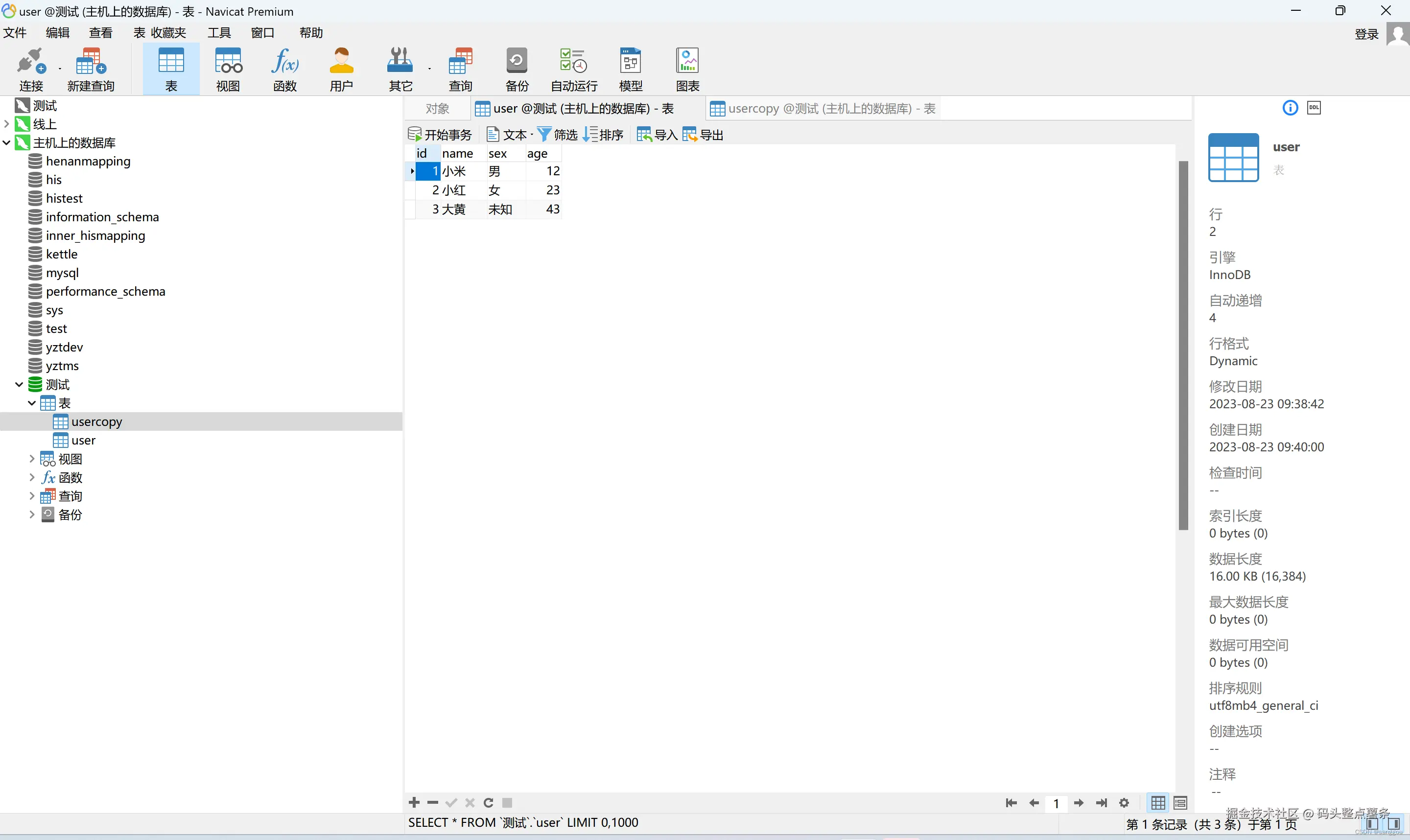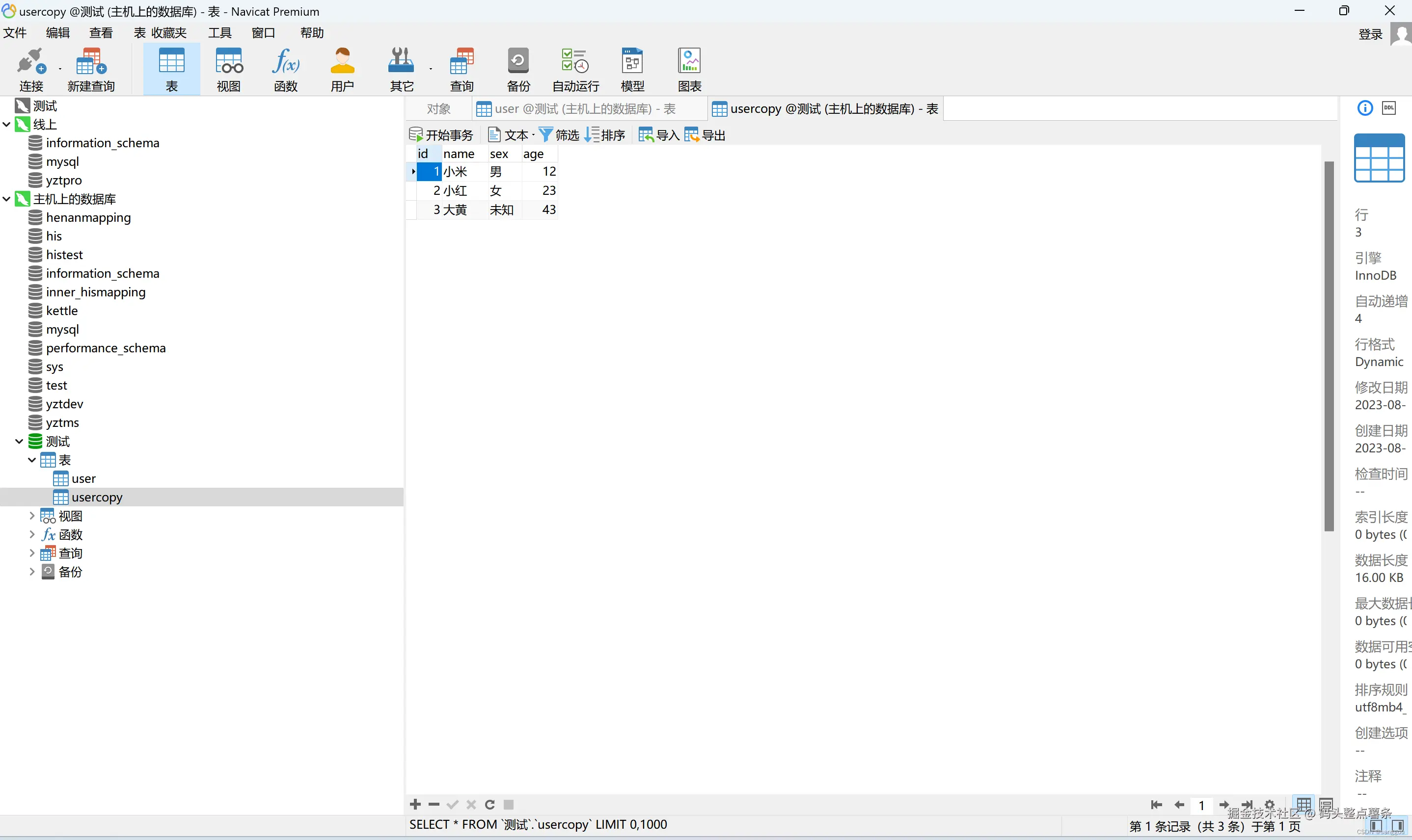 这里我那user表作为查询表,usercopy作为插入表,里面初始化内容如下: