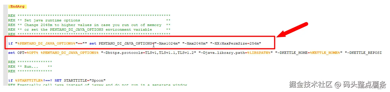 - 在确保jdk版本没问题的条件下,如果还是打不开,可能是电脑的内存不足,需要调整给Kettle的启动空间,可采取以下方法:使用记事本或者其他的编辑软件打开spoon.bat,找到以下代码,将其中的"1024"和"2048"改为"512",保存退出,重新打开spoon.bat即可正常运行。