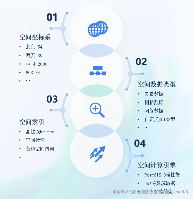 YashanDB 23.1 版本对地理空间数据管理模型进⾏了扩展,增加了⽮量数据、标准函数、空间索引等功能,使得数据库具备高性能地理空间⽮量数据管理能⼒。