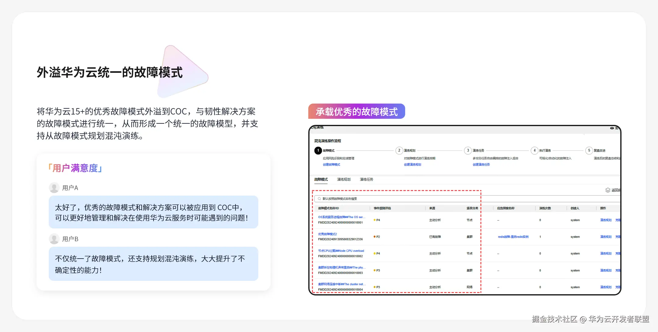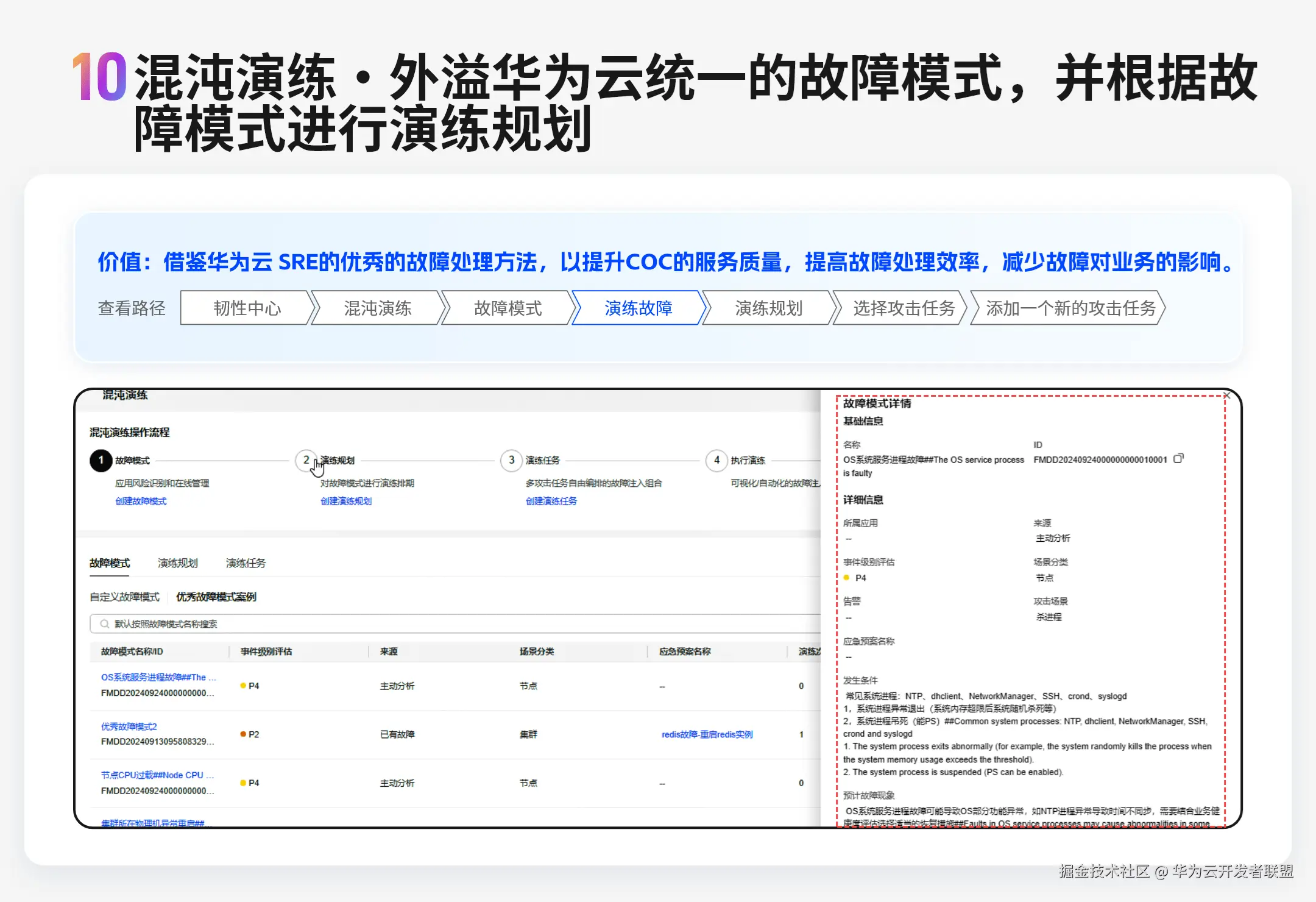 - 混沌演练:外溢华为云统一的故障模式,并根据故障模式进行演练规划