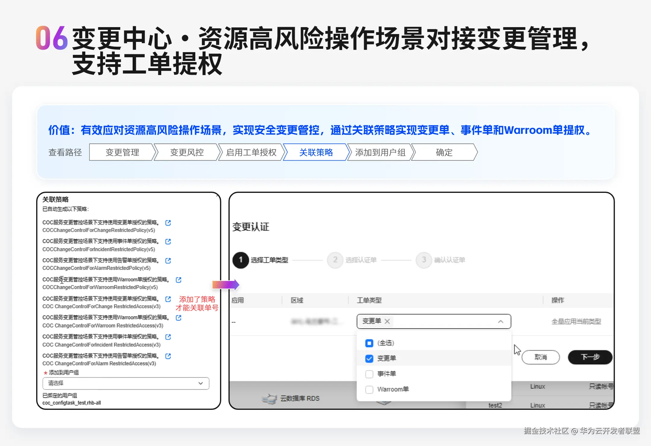 - 变更中心:资源高风险操作场景对接变更管理,支持工单提权