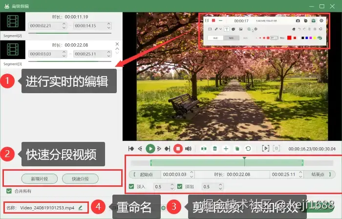 步骤3:录制的过程中,可以使用工具箱里的工具对视频进行实时的编辑与绘制。录制结束后也可以进入 【高级剪辑】 中剪辑视频并为视频增加特效等后期处理。