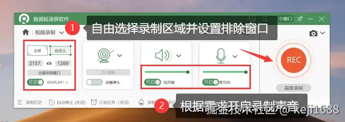 步骤2:在录制开始前,我们根据录制的需求自由选择录制区域并调整好录制的声音,设置完毕即可点击 【REC】 按钮进行录屏。