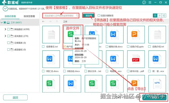 步骤2: 等待软件扫描结束后,可以选择使用搜索框、筛选器辅助自己更快找目标文件;选中文件后点击【导出】 ;