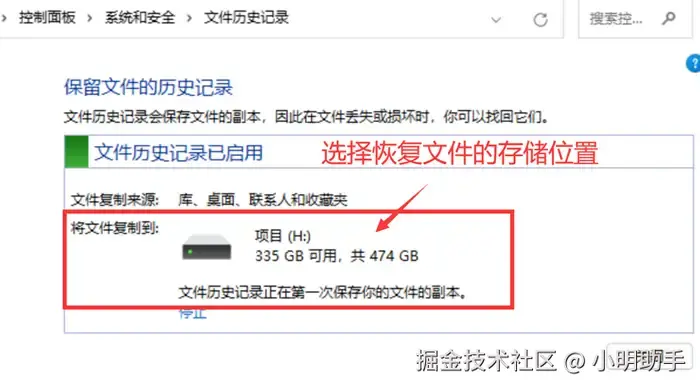 在电脑“设置”中打开【文件历史记录】 的页面。进入新页面后,到左侧点击【还原你的个人文件】 。然后定位误删文件的位置,选择好需要恢复的文件备份,将其恢复到目标位置。
