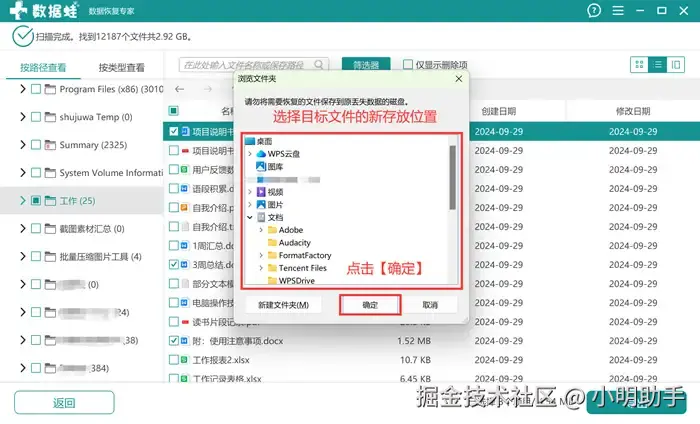 步骤3: 然后在【浏览文件夹】中选择目标文件的新存放位置,完成优盘文件恢复。