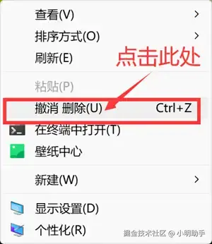 让电脑停留在误删文件的页面上,鼠标在空白处按下右键,然后点击【撤销 删除】。